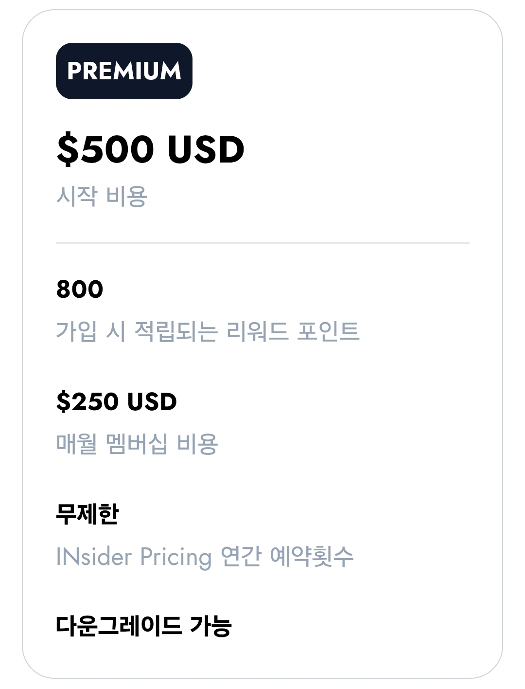 - 프리미엄: $3,250 ($250 가입비 + $3,000 연회비)
